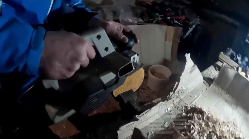 Устанавливаем круг в тиски, после чего начинаем строгать его электрорубанком. Затем стружку необходимо будет «просеять» от опилок. Для этого автор использует пластмассовый ящик для фруктов и овощей.