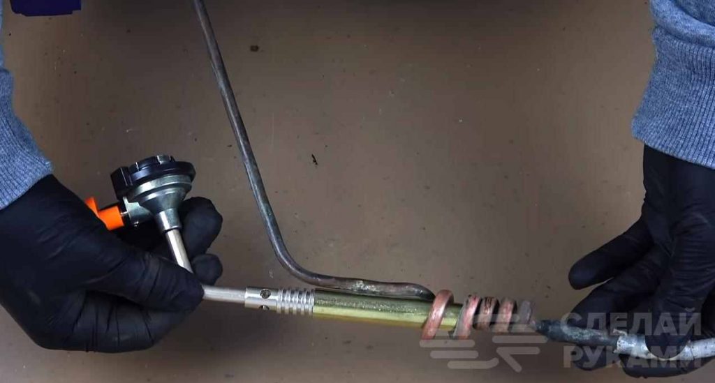 Далее необходимо будет с помощью металлического хомута зафиксировать горелку для газового баллончика на медной трубке.