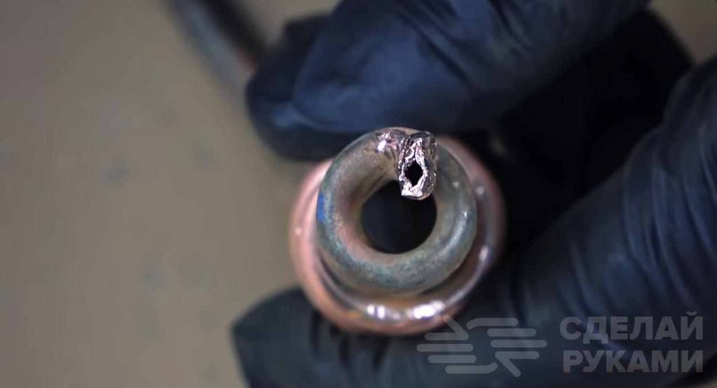 На следующем этапе отрезаем часть змеевика, вставляем в отверстие кусок прутка или тонкую шпильку, и надо будет немного расплющить конец трубки, чтобы получилось узкое отверстие.