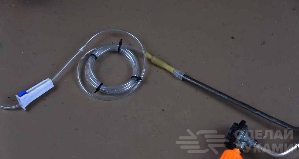 Для удобства сам пластиковый флакон с пестицидами автор решил прикрепить к газовому баллончику. Для этой цели он использует армированный скотч.