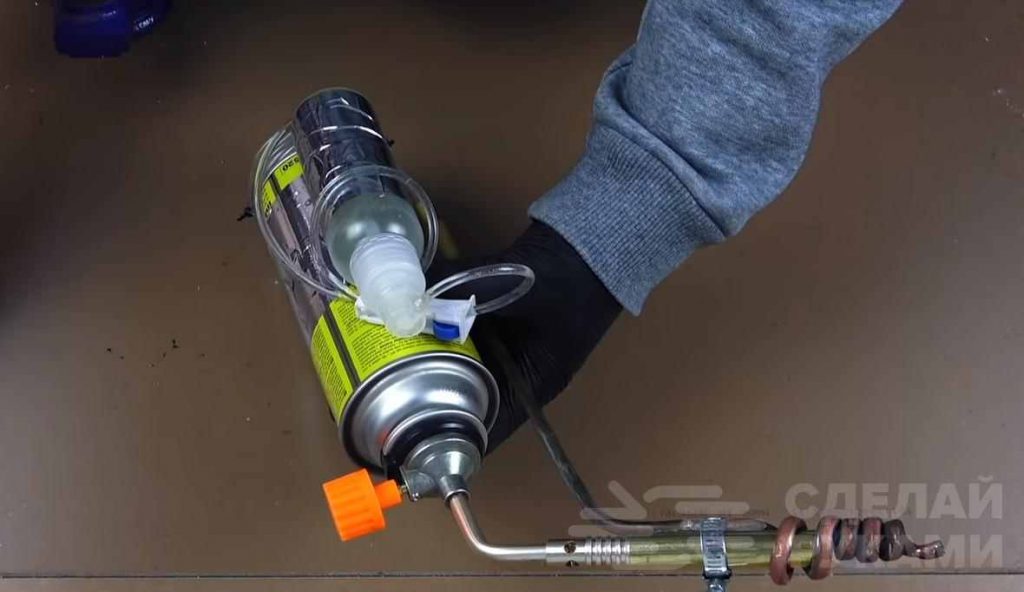 Чтобы изготовить эту самоделку, потребуется газовый баллончик с горелкой, медная трубка, металлический хомут, стяжки, силиконовый шланг от капельницы, пустой флакон (желательно пластиковый и с распылителем).