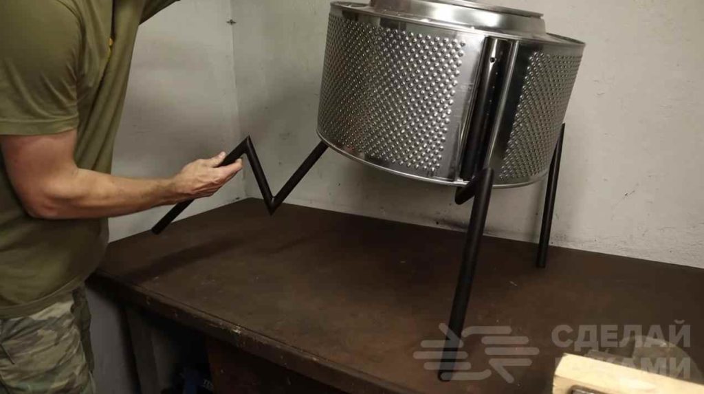 Из отрезков труб автор сваривает три ножки зигзагообразной формы для будущего барбекю-гриля. Ножки нужно будет обезжирить и покрасить аэрозольной краской. После этого устанавливаем ножки в отверстия в барабане.