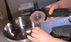 Для этой полезной самоделки понадобится кухонная миска или любая другая емкость полусферической формы (желательно использовать посуду из нержавеющей стали). В данном случае используется металлическая крышка от блюда. И первым делом на ней нужно срезать ручку. Затем можно приступать к основным этапам работ.