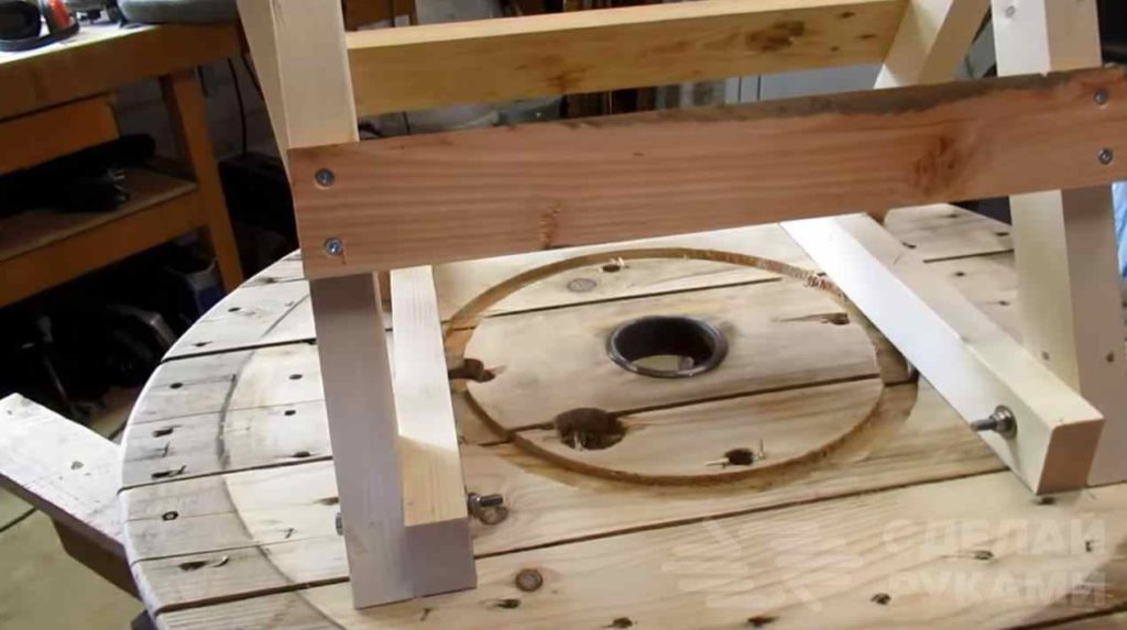 Собственно, боковая часть катушки для кабеля выступает в качестве столешницы. Основная задача — сделать ножки, которые бы складывались. Такой стол — отличный вариант для дачи.