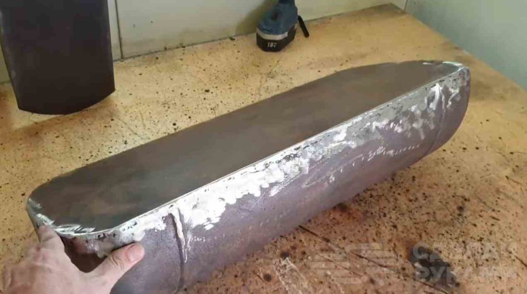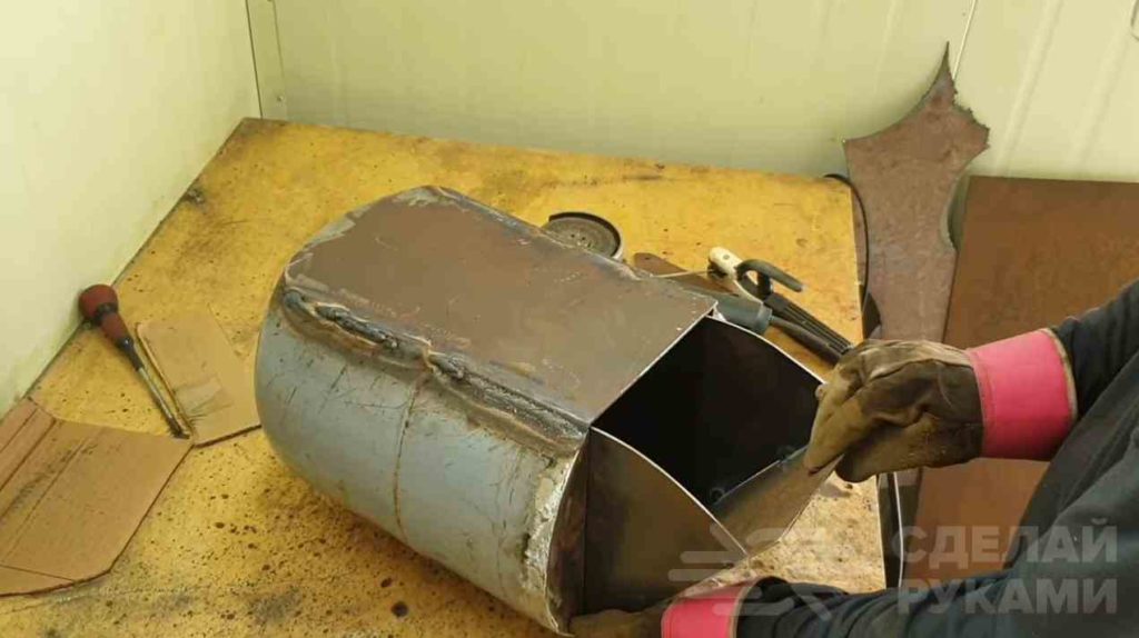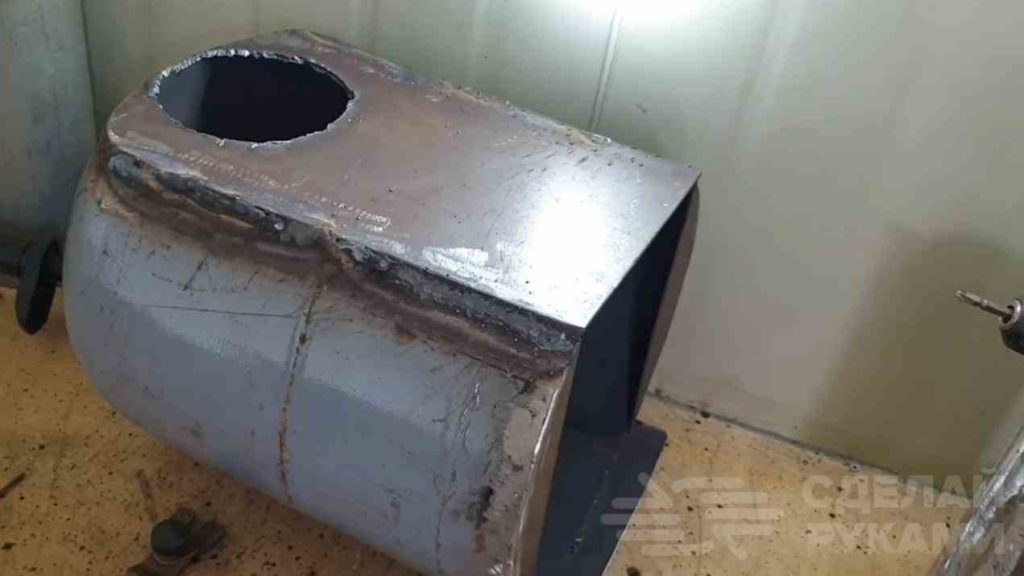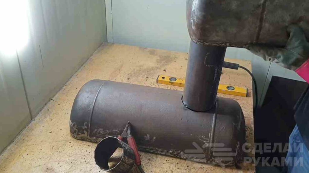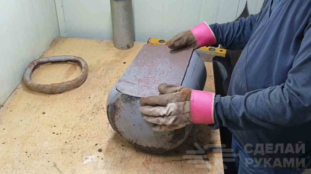 Первым делом автор отрезает все лишнее от газового баллона объемом 27 литров. Потом вырезаем варочную поверхность из листового металла и привариваем ее к баллону.