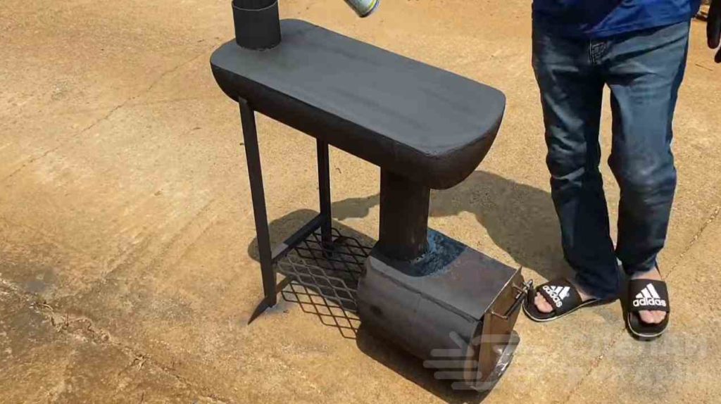 На последнем этапе в нижней части привариваем полку из стальной решетки. Зачищаем металл и красим термостойкой краской.