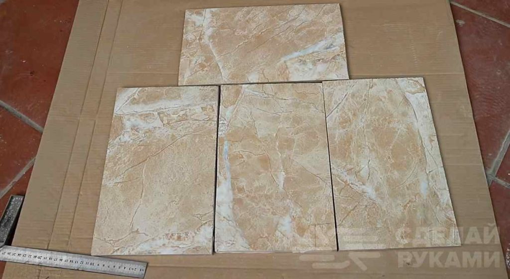 Потом отрезаем по размеру куски керамической плитки. Нам потребуется четыре отрезка прямоугольной формы.