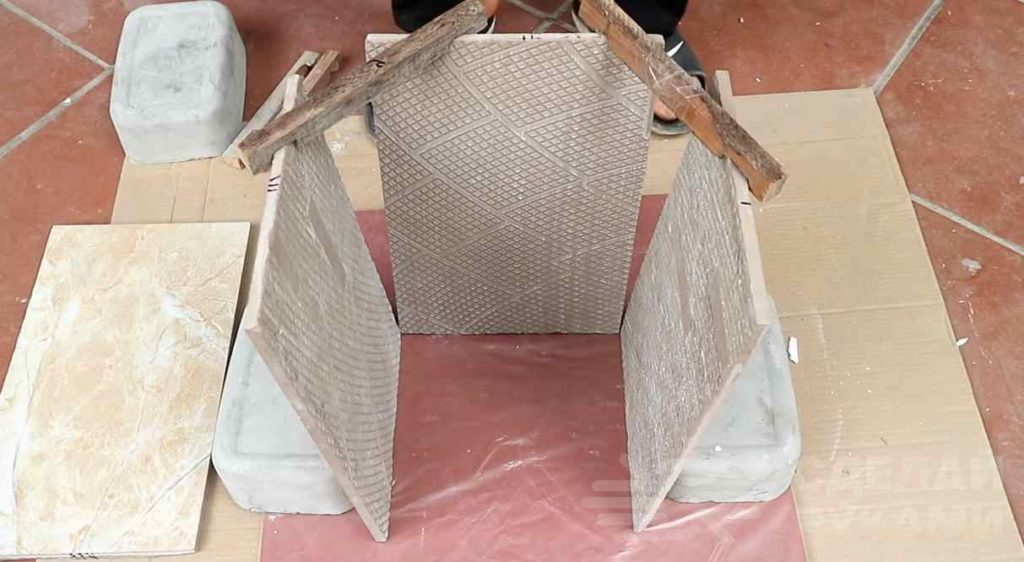 Далее нужно будет приготовить раствор из плиточного клея. Заполняем зазоры между плитками. Чтобы раствор не проваливался, устанавливаем кусок плитки с наружной стороны.