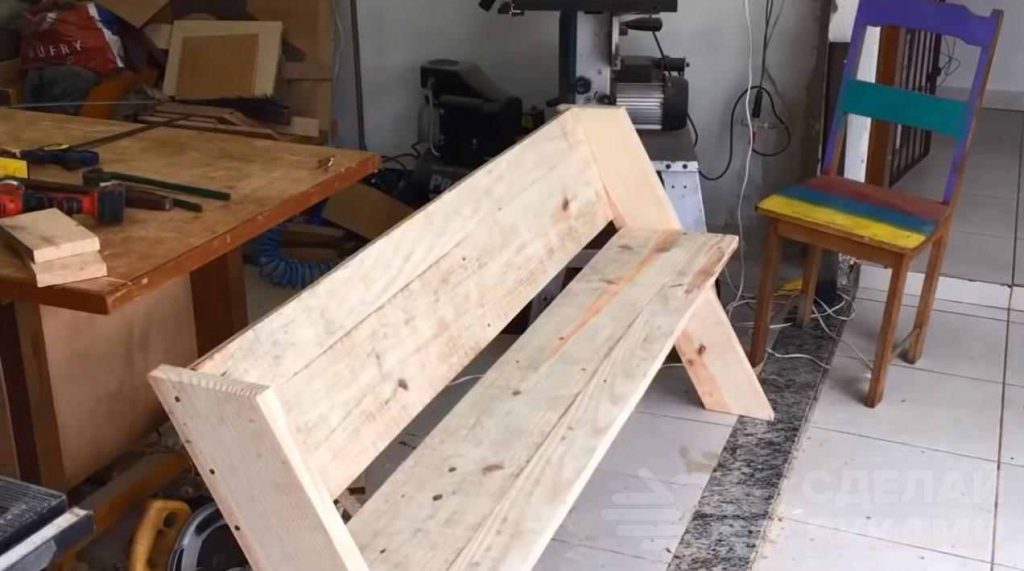 На последнем этапе устанавливаем и закрепляем второй щит — это будет спинка лавки. И потом останется только покрыть скамейку лаком или просто покрасить.