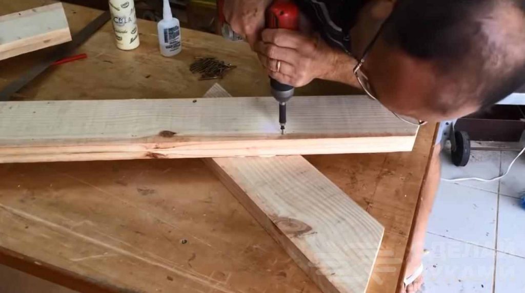 Далее отрезаем края толстых досок под углом и соединяем их вместе. Всего потребуется две длинных доски и короткие (тоже две штуки).