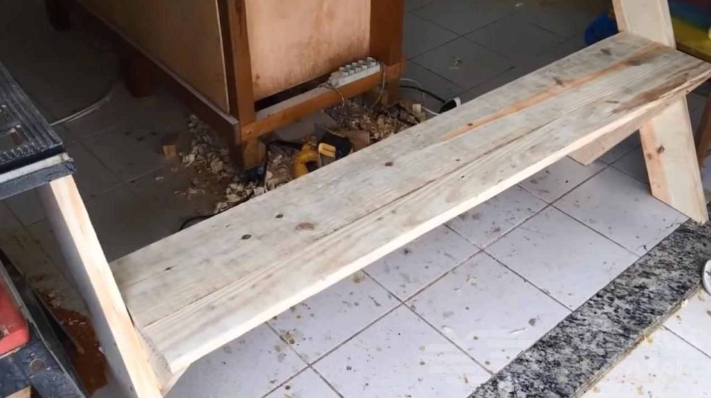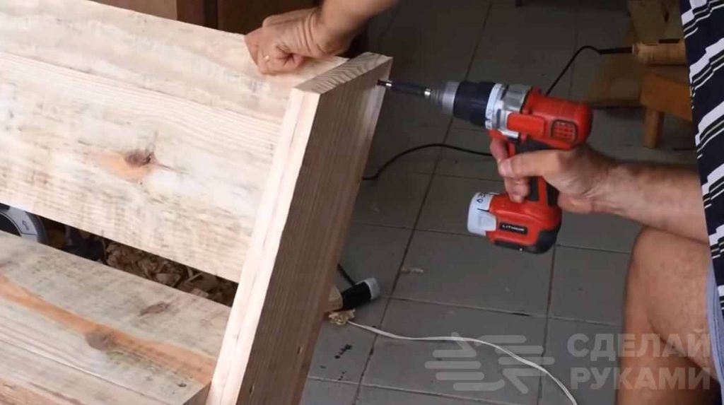 После этого на торцы коротких досок укладывается первый щит, склеенный из дюймовых досок. Это будет сиденье. Его можно прикрутить на саморезы или же прибить гвоздями.