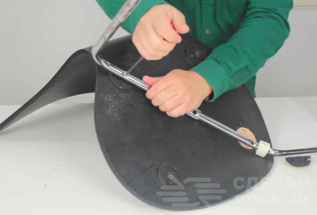 В металлической ножке и подлокотниках стула надо будет просверлить крепежные отверстия. Далее крепим металлическую П-образную ножку к подлокотникам при помощи болтов с гайками.