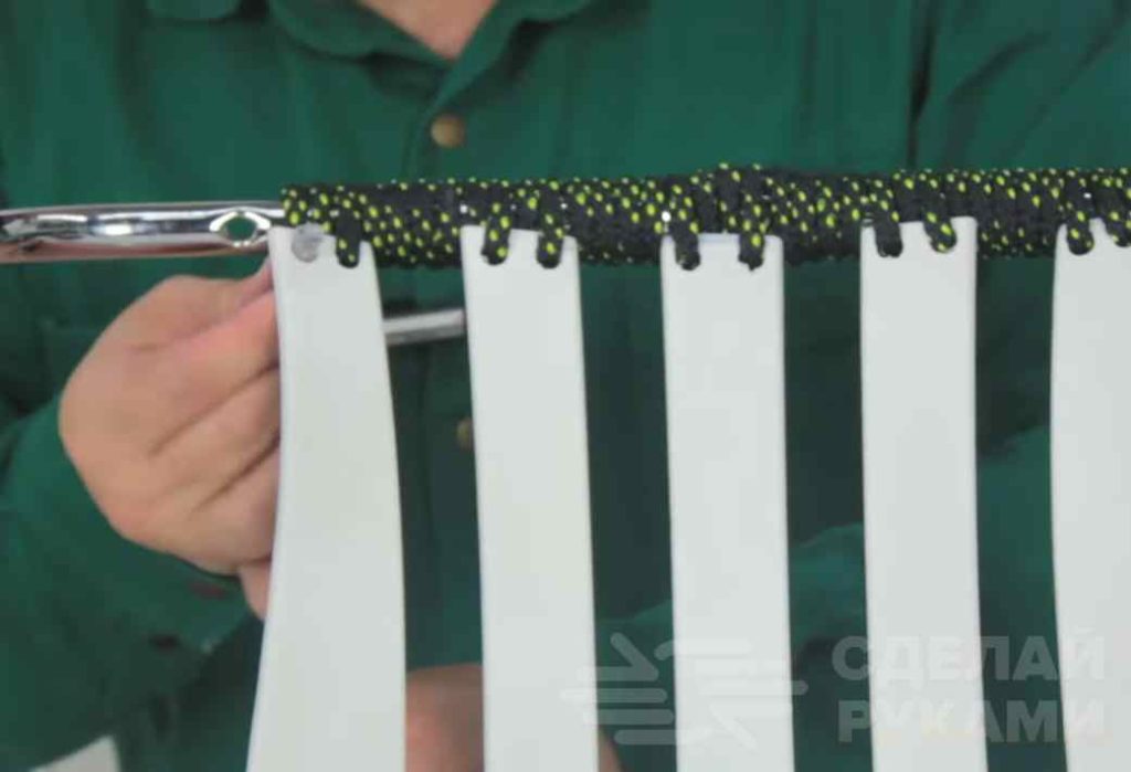 Спинку стула фиксируем к верхней перекладине с помощью прочной веревки. Для этого в каждой «ламели» нужно будет просверлить отверстия.