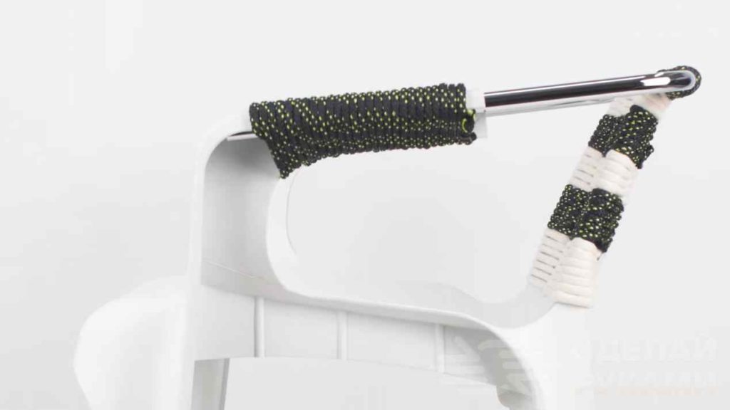 Потом перематываем веревкой всю спинку стула полностью, а также подлокотники. Результат получился очень даже ничего. На дачу — самое то!