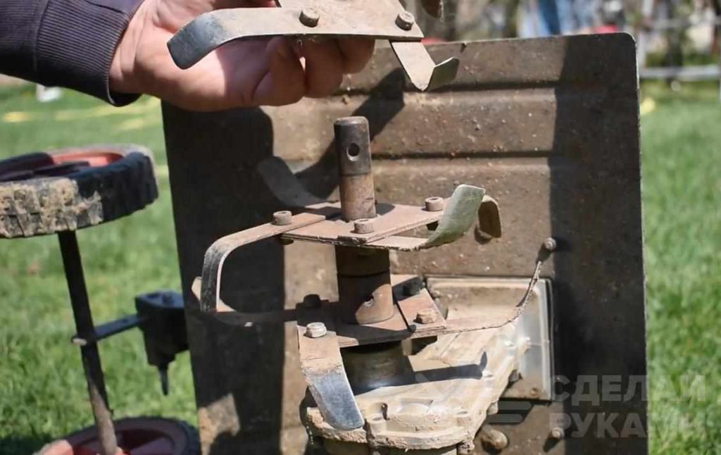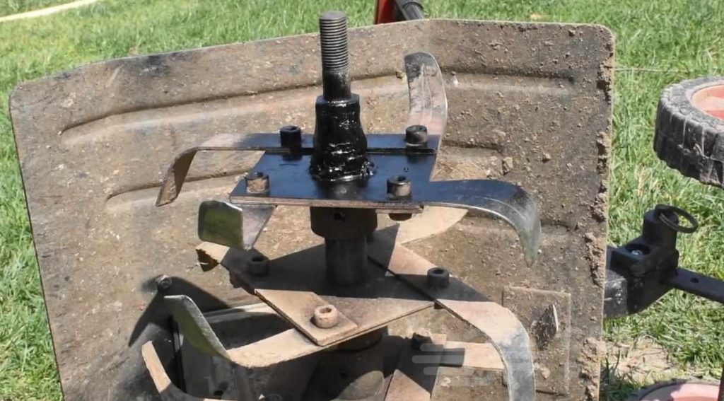 Первым делом необходимо будет снять крайнюю втулку с режущими ножами, которая находится на валу мотоблока.