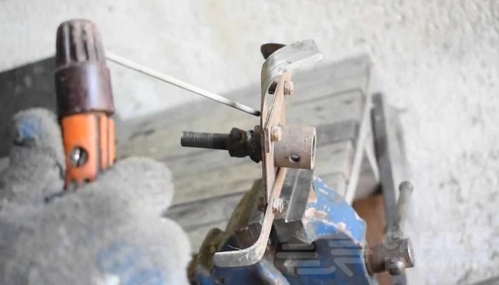 Далее автор надевает втулку с режущими ножами и болтом обратно на вал. Предварительно зашлифованный металл он покрасил краской из баллончика. На болт накручивается патрон от дрели.