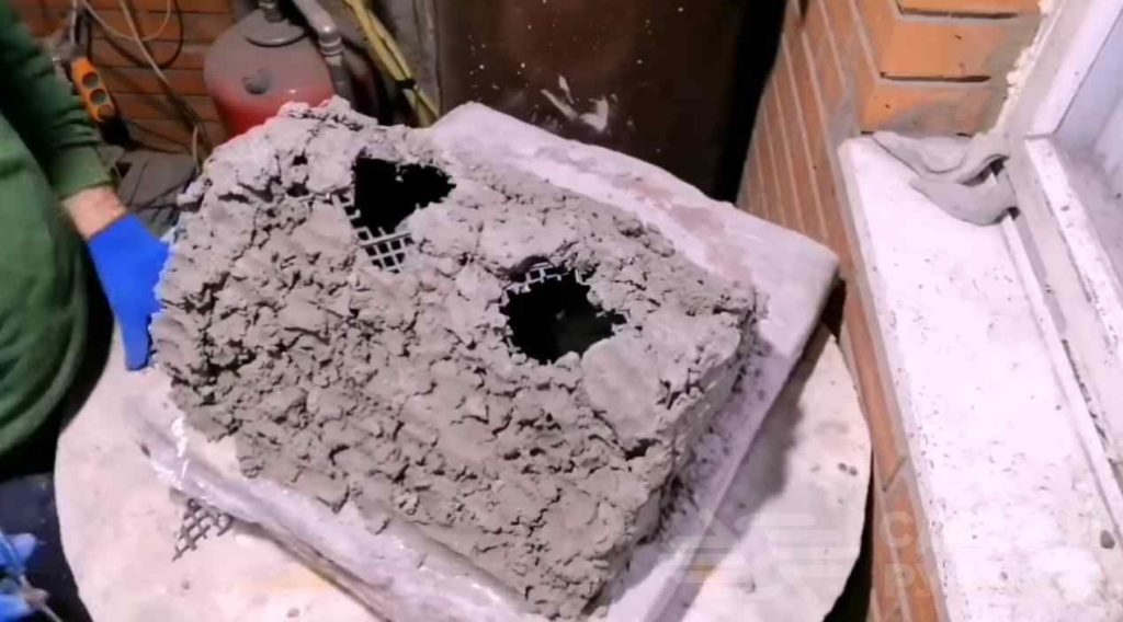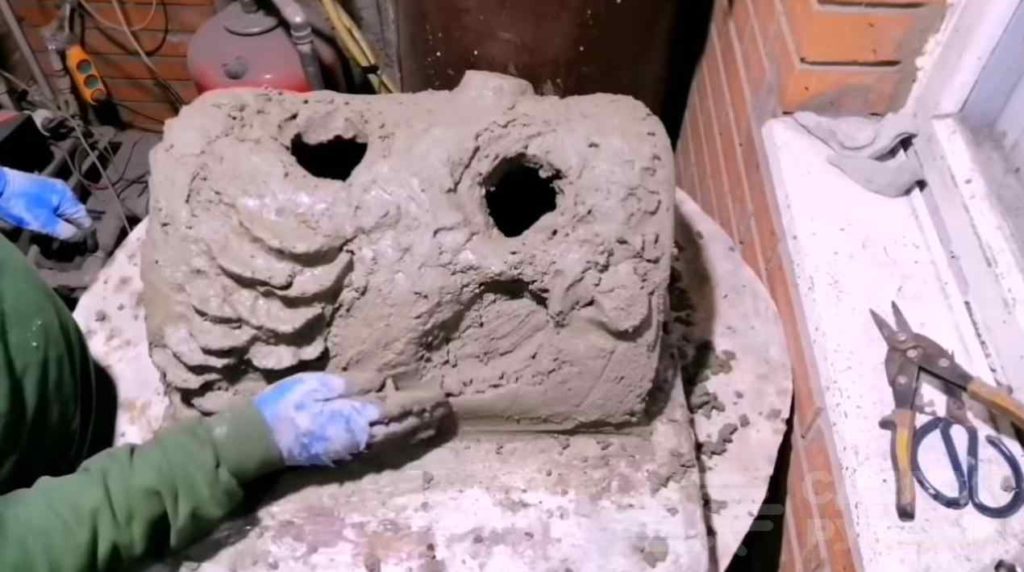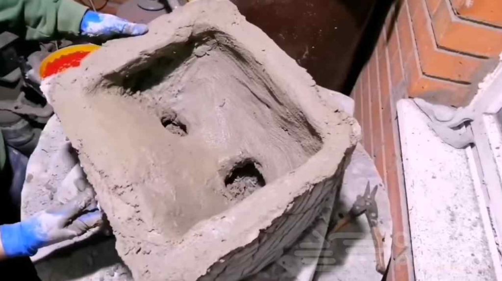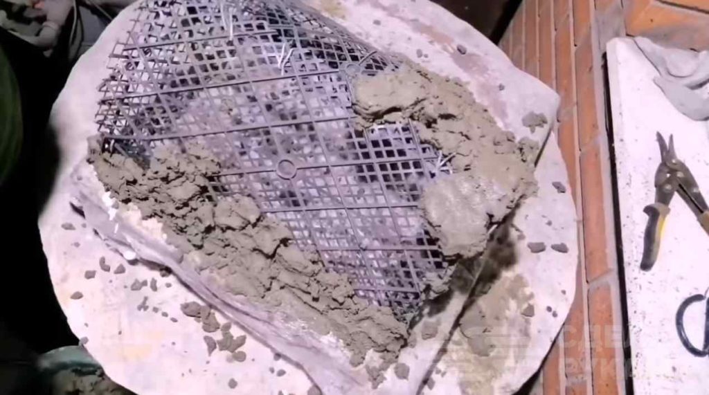 На следующем этапе замешиваем цементно-песчаный раствор (для этого берем 1 часть цемента и 2 части песка). Обмазываем наружную сторону формы. В верхней части делаем два отверстия.