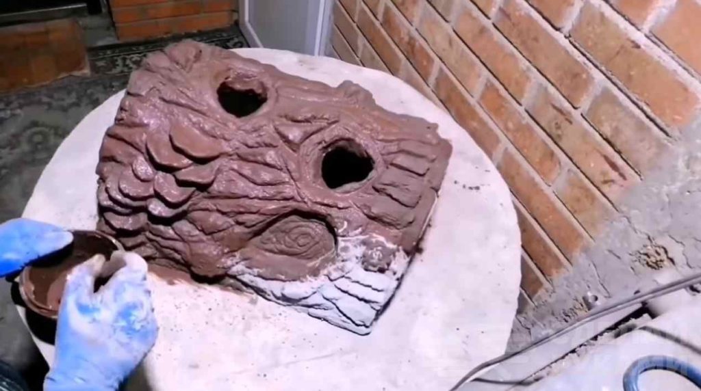После высыхания первого слоя наносим второй слой раствора. Формируем фактуру поверхности, которая имитирует различные наросты на бревне. Затем делаем текстуру древесной коры.