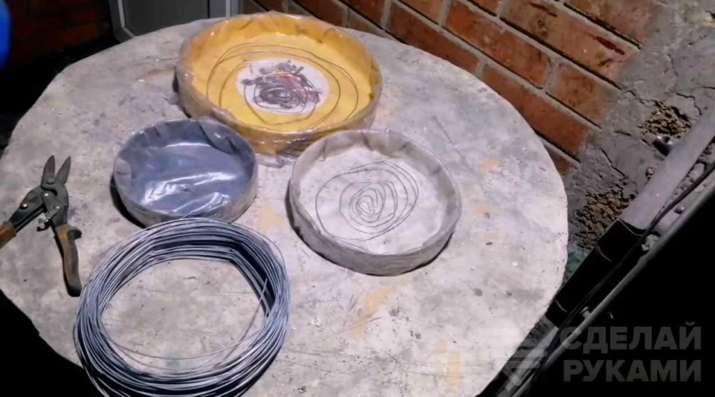 Изготовить декоративные плитки можно двумя разными способами. Начнем с первого. Для этого из мягкой стальной проволоки толщиной 1-2 мм делаем спираль и укладываем ее на дно формы.