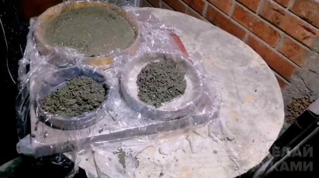 Но есть и второй способ. Застилаем формы пленкой и выкладываем бетонный раствор (слой такой же, как и в первом варианте). Хорошо вибрируем формочки.