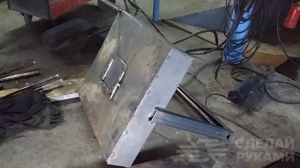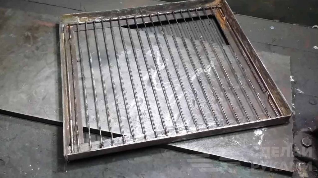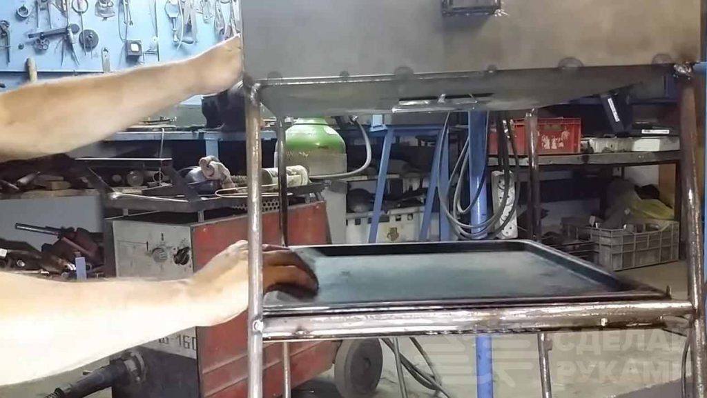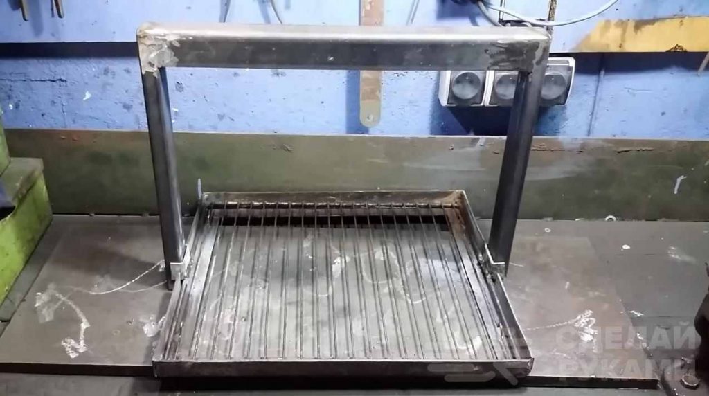 Затем из круглых труб надо будет сварить каркас. К верхней части приваривается рамка с решеткой, а под ней — поддон для сбора жира. К нижней части каркаса нужно приварить колесики.