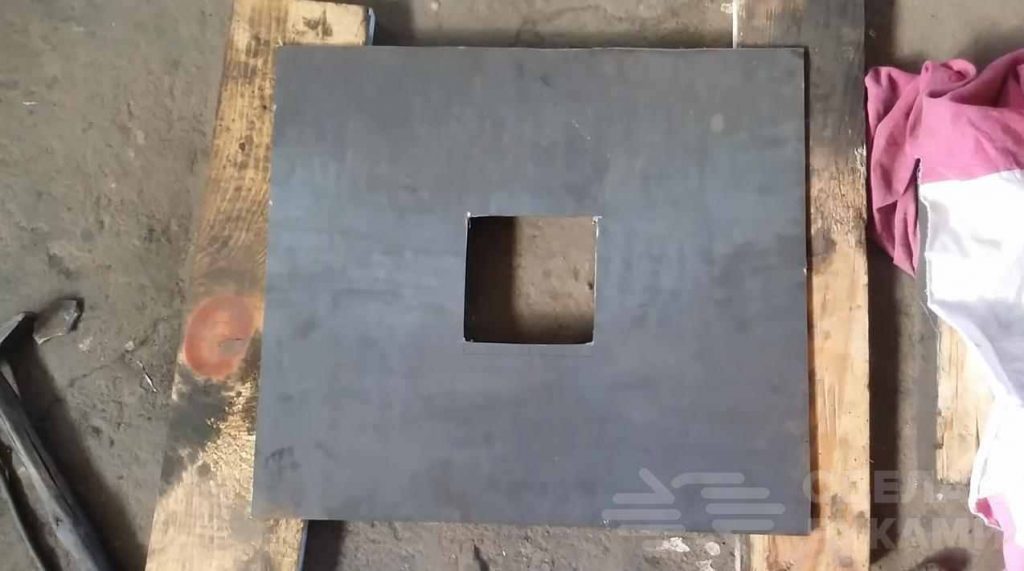 Далее по форме рамки из листа металла толщиной 4-5 мм вырезаем квадрат. И в нем по центру вырезаем квадратное «окно».