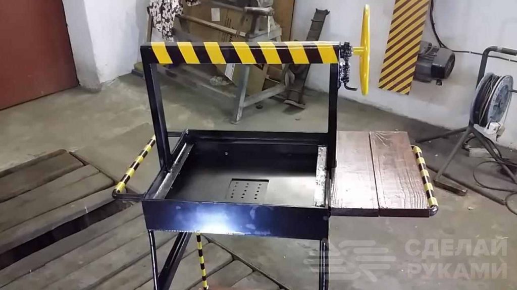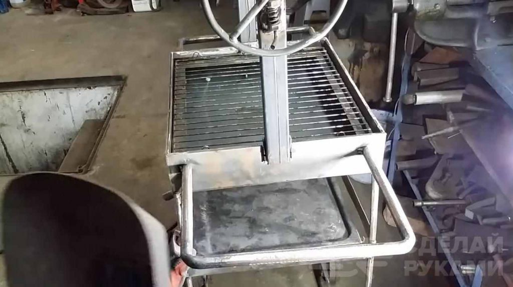 На последнем этапе останется только отшлифовать сварные швы, зачистить и покрасить металл. Подробно о том, как сделать своими руками барбекю-гриль с подъемным механизмом, смотрите в данном видеоролике.