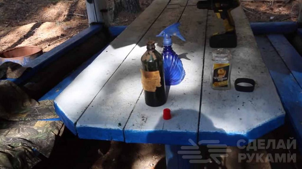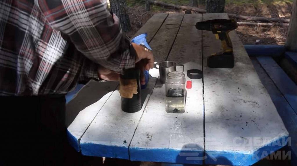 Затем добавляем в воду немного березового дегтя. Затем все надо будет размешать с помощью шуруповерта и самодельной насадки из проволоки.