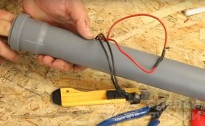 Пропускаем провода в длинную пластиковую трубу, а затем соединяем ее с отводом, в котором установлен моторчик. Вырезаем в трубе прорезь под установку переключателя — соединяем его с проводкой и фиксируем на термоклей. Вставляем в трубу аккумуляторную батарею, после чего закрываем отверстие заглушкой.
