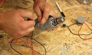 Первым делом подключаем к контактам электродвигателя два провода (места соединения надо закрыть термоусадочной трубкой), после чего вставляем моторчик в угловой пластиковый отвод, в котором предварительно нужно просверлить небольшие отверстия для его охлаждения. На вал двигателя устанавливаем кулачковый патрон.