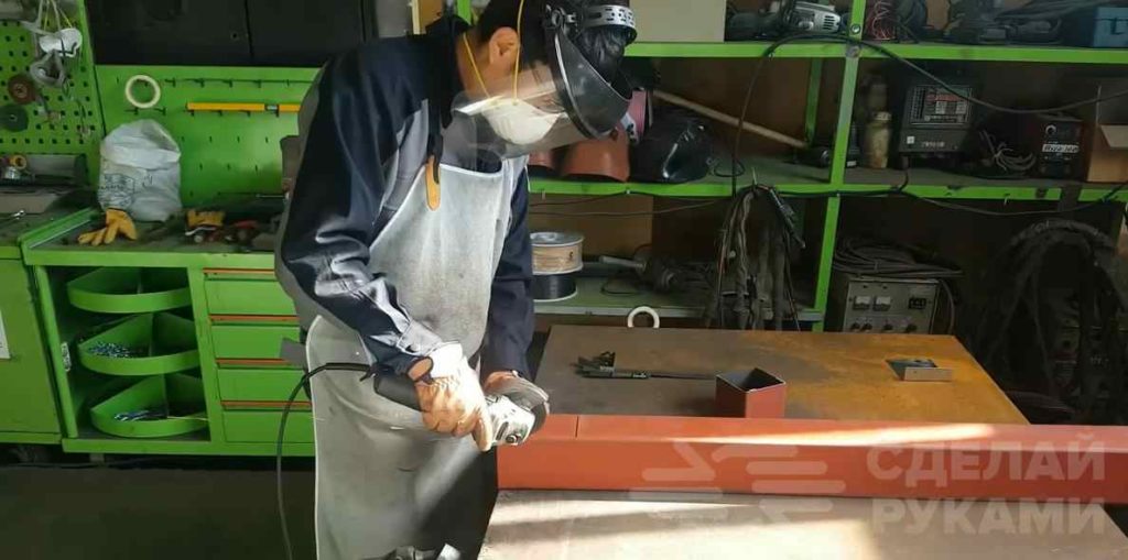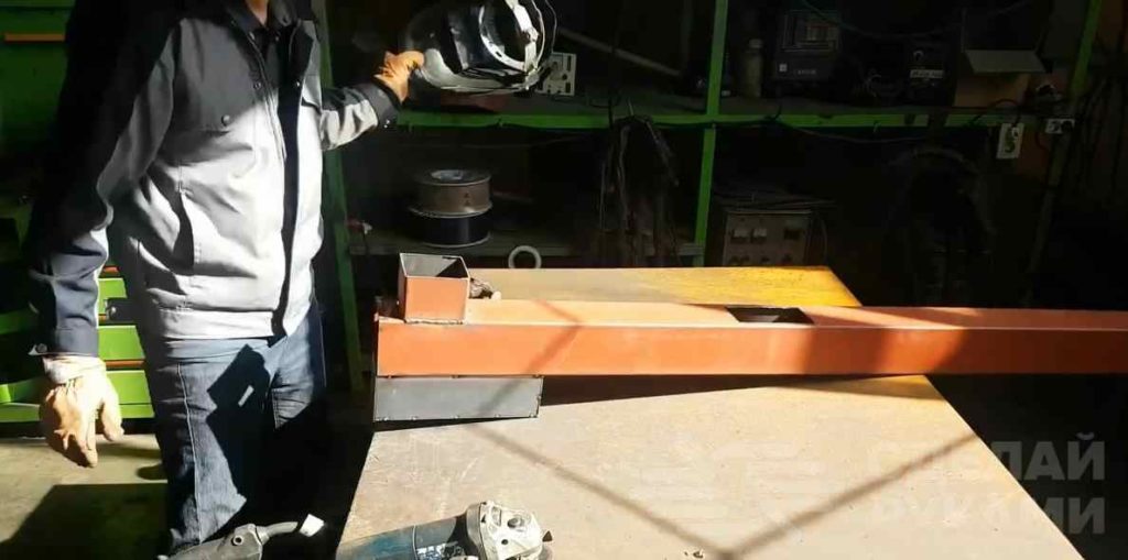 Для начала отрежем от квадратной трубы необходимую длину будущего стола. Вырезаем с одного края верхнюю полку. С обратного края — круглое отверстие для дымовой трубы.