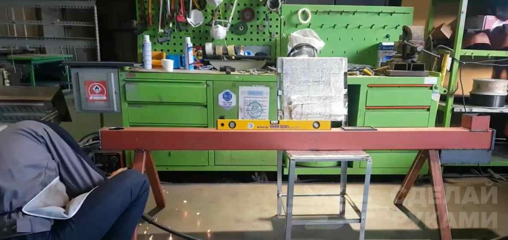 Ближе к топке укладываем сетку и прихватываем её сваркой, а на дальнюю половину кладём плоский лист и тоже прихватываем сваркой.