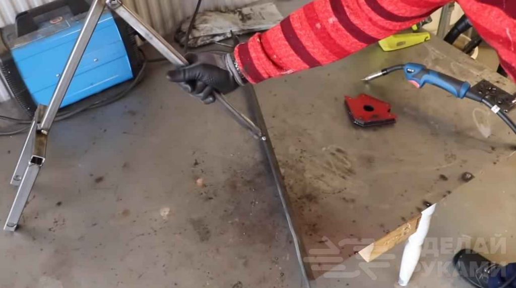 Первым делом из коротких и длинных отрезков профиля, а также куска полосы надо сварить основную конструкцию приспособления.