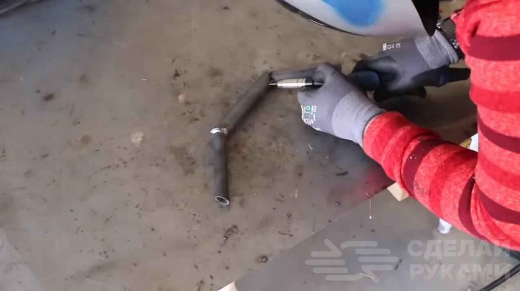 Из трех круглых отрезков стальной трубы необходимо сварить ручку. Потом мастер приваривает ее к основной конструкции. После этого нужно будет зачистить швы с помощью лепесткового круга.