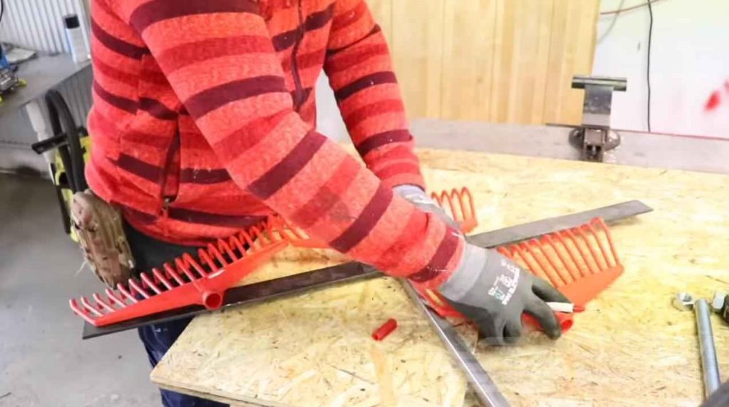 На следующем этапе работе нужно прикрепить пластиковые грабли к полосе. И для этого сначала нужно сделать разметку и просверлить в полосе сквозные отверстия.