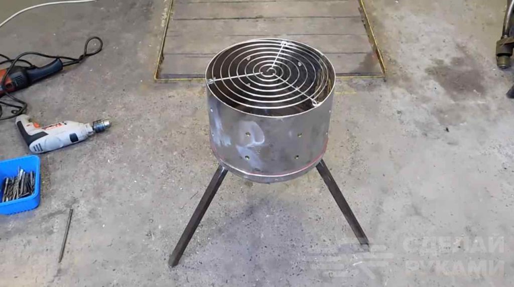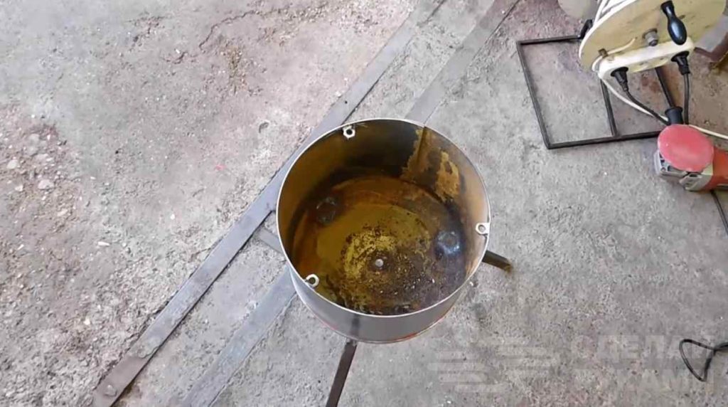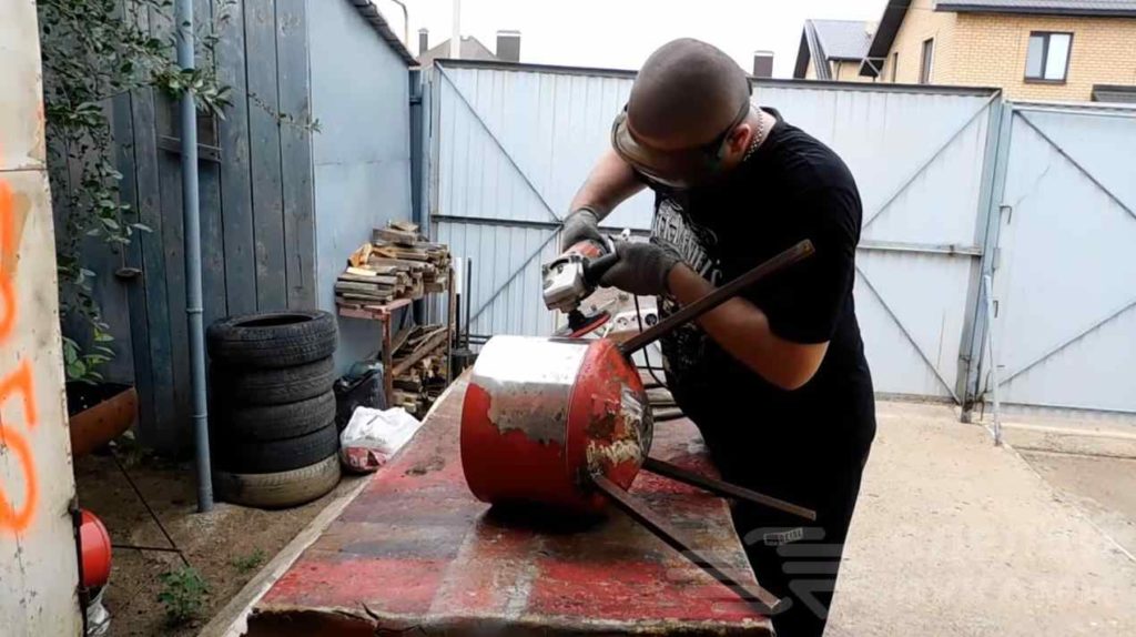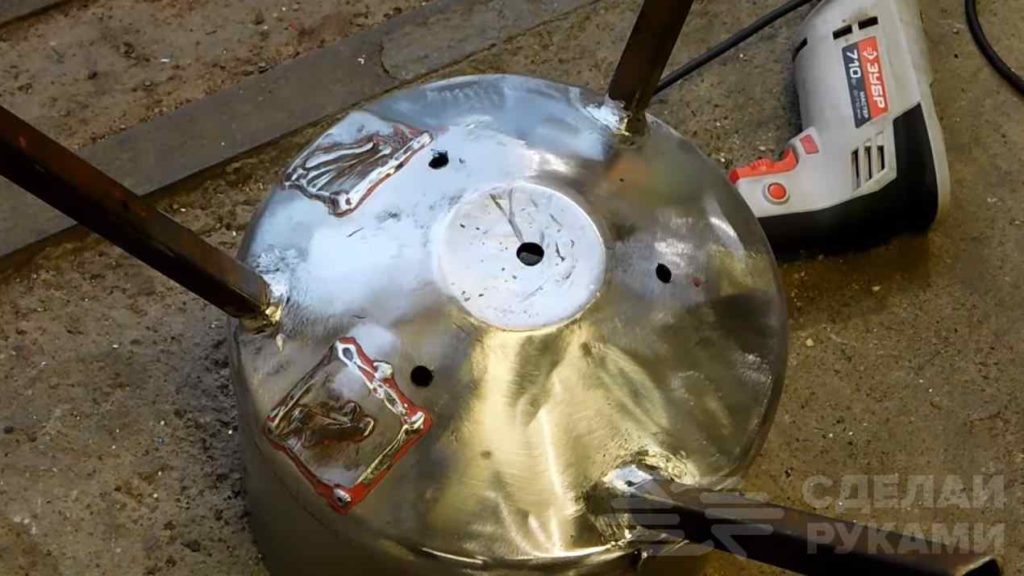 К получившейся чаше нужно приварить три ножки из профиля квадратного сечения. Но можно и из круглых труб сделать. Краску на баллоне нужно зачистить болгаркой.
