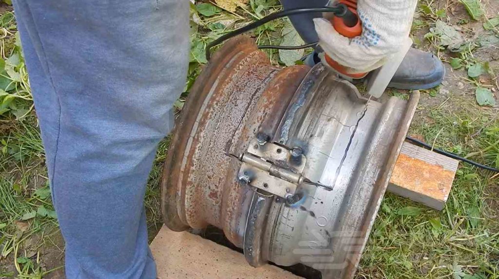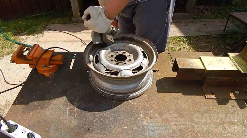 Первым делом с помощью болгарки автор вырезает в одном из колесных дисков отверстие в центральной части.