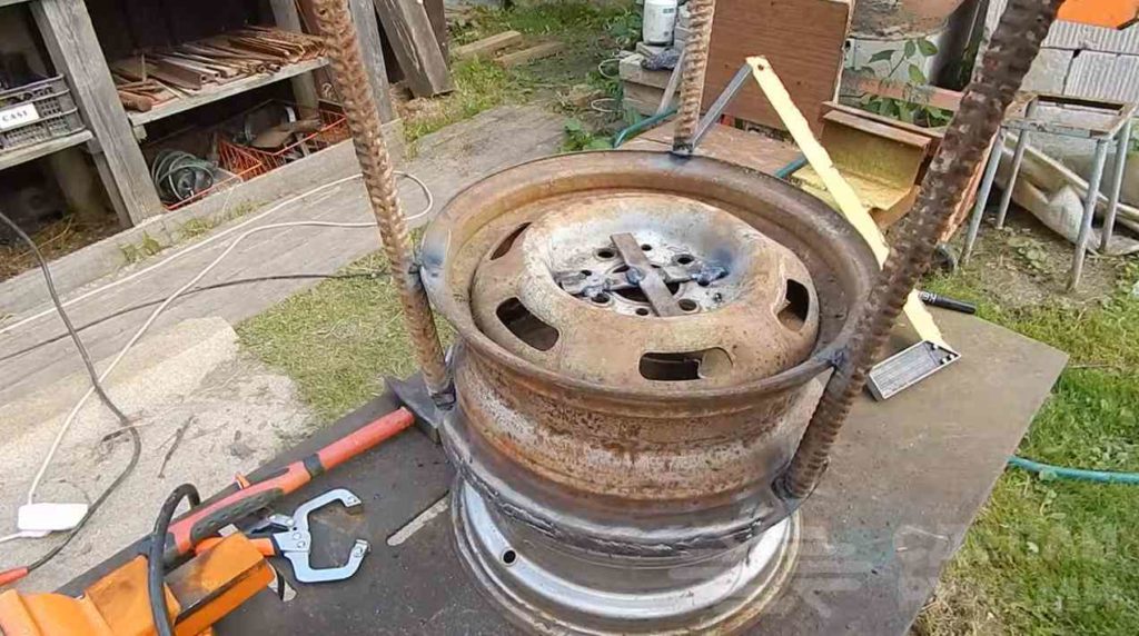 Далее автор отрезает три куска арматуры и приваривает их к нижнему автомобильному диску.