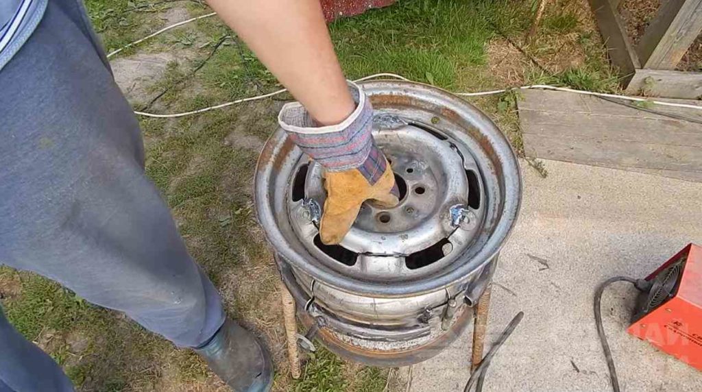 К ранее вырезанной «сердцевине» колесного диска мастер приваривает отрезки пластины, чтобы она не проваливалась внутрь печи. Это будет универсальная подставка под чайник и сковороду.