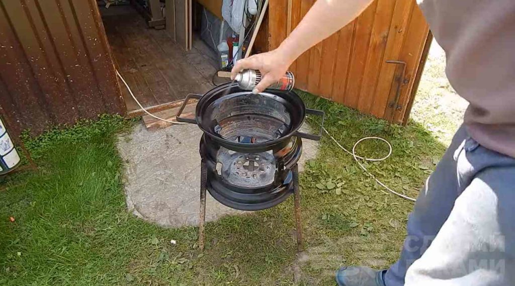 Обжигаем колесные диски изнутри, потом зачищаем их при помощи болгарки и красим матовой термостойкой краской.