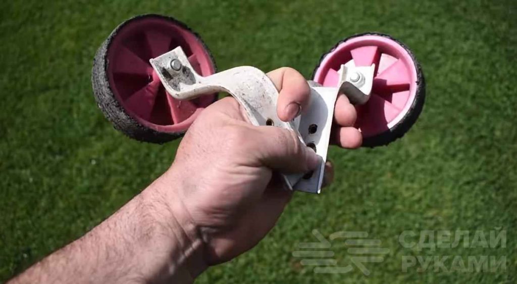 В данном обзоре автор делится идеей, как сделать простой инструмент для работы на даче. Для этого используются крепления для вспомогательных велосипедных колес, кусок металлической полосы и держак.