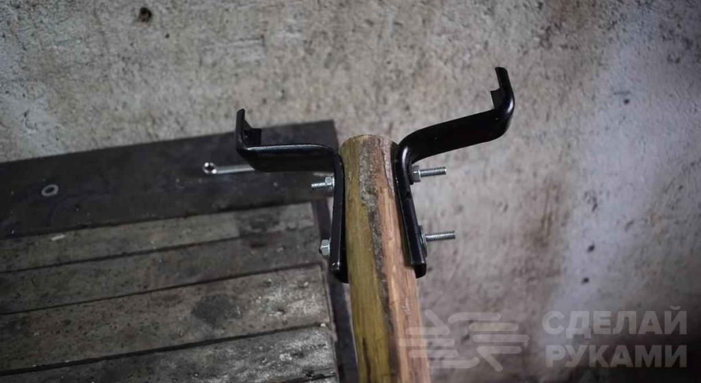 Далее отрезаем держак нужной длины или можно взять старый держак от лопаты или граблей. Делаем разметку и сверлим сквозное отверстие. Потом крепим крепления с помощью шпильки и гаек.