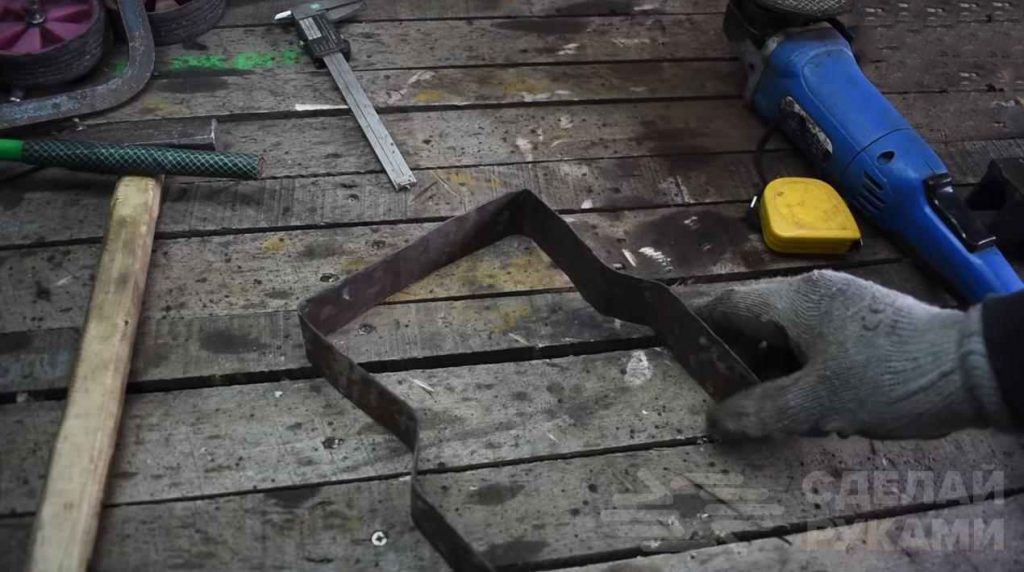 На следующем этапе из куска металлической полосы надо сделать «насадку» на инструмент. Она представляет собой букву «П» с изогнутыми ножками.