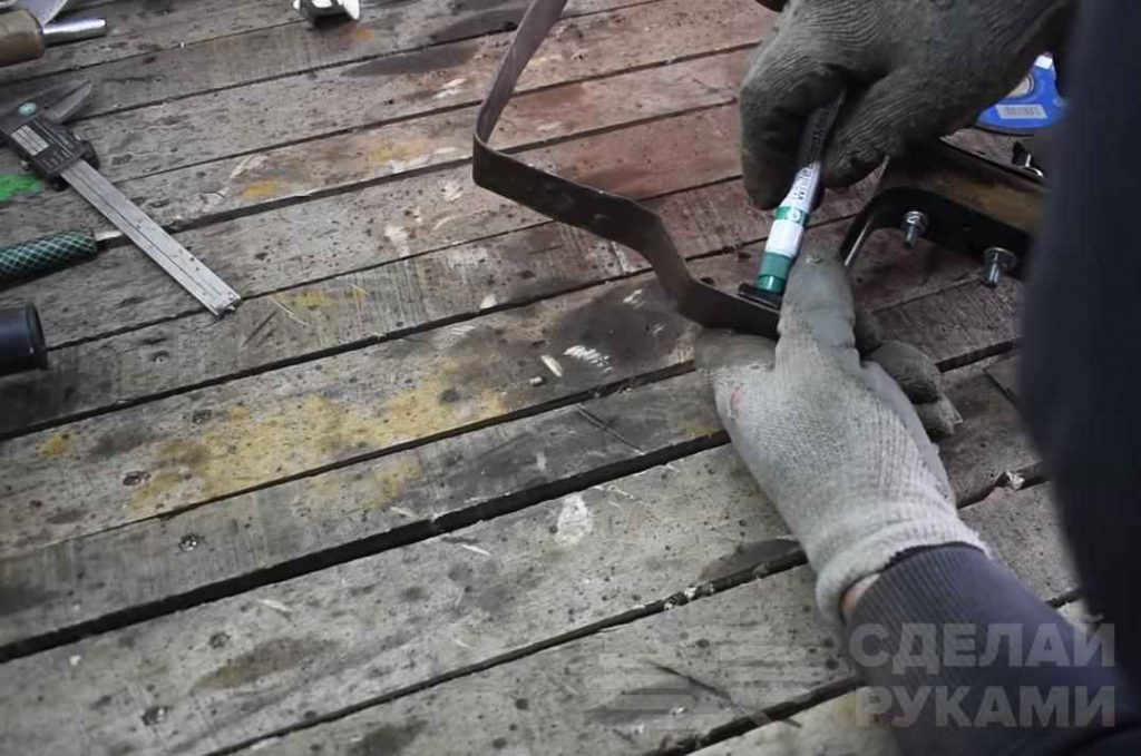 Далее маркером размечаем места для сверления отверстий в «насадке», сверлим отверстия и крепим ее к креплениям на держаке при помощи болтов.
