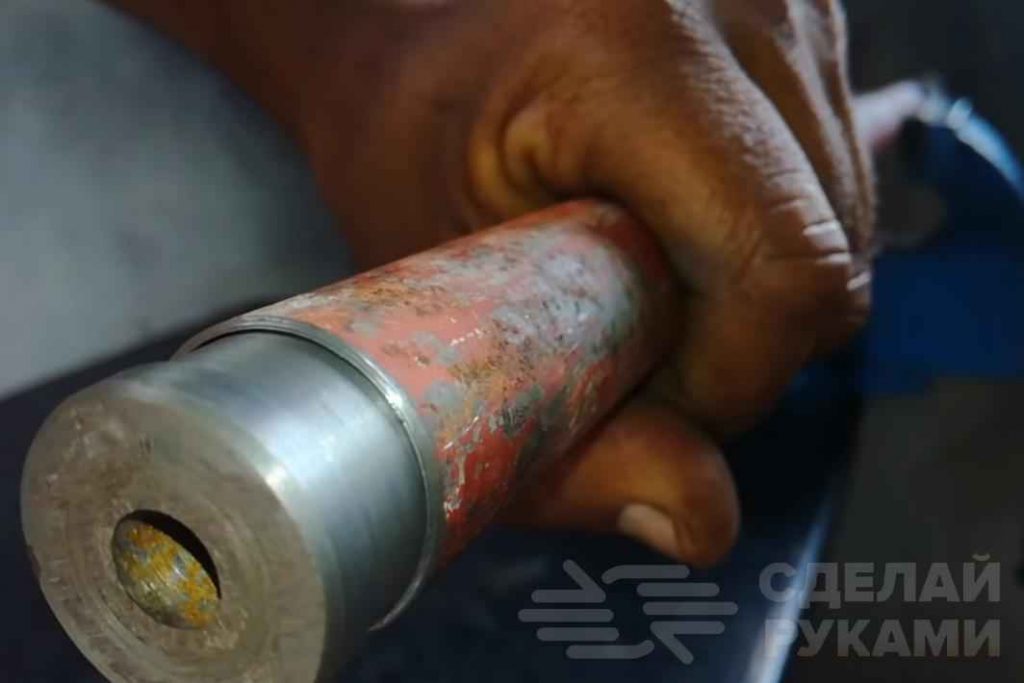 Далее внутрь трубы с разных сторон мастер запрессовывает три направляющие втулки (две втулки устанавливаются по краям трубы, и одна — в середине), выточенные на токарном станке.