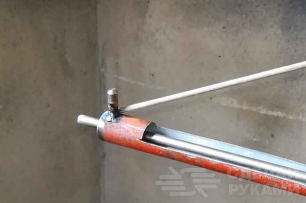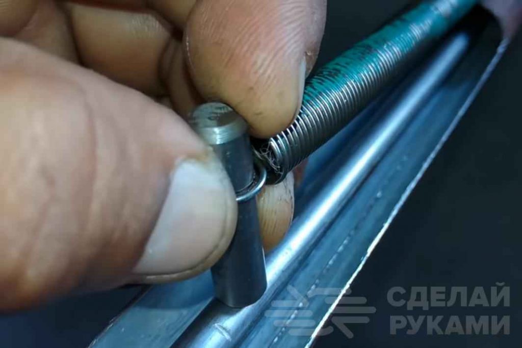 Через отверстия в направляющих втулках нужно будет продеть стальной пруток. К концу трубы приваривается небольшой кусок прутка перпендикулярно осевой линии трубы. За него потом будет цепляться край пружины — для этого надо сделать канавку по окружности.