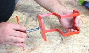 К концу шпильки привариваем металлический стержень, чтобы удобнее было откручивать и закручивать приспособление. Получившуюся конструкцию зачищаем болгаркой, после чего покрываем 1–2 слоями аэрозольной краски. Шпильку отрезаем по размеру и вкручиваем в отверстие в пластине, надев предварительно гайку. Теперь приспособление готово к работе.