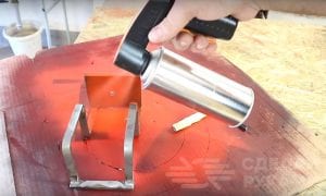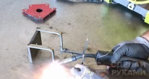 Сначала необходимо просверлить по центру пластины сквозное отверстие, и нарезаем в нем резьбу под диаметр шпильки. Далее сгибаем четыре полоски металла под углом 90 градусов. Две из заготовок привариваем к пластине, а два оставшихся — к ранее приваренным полоскам, и дополнительно соединяем их при помощи еще одной полосы.