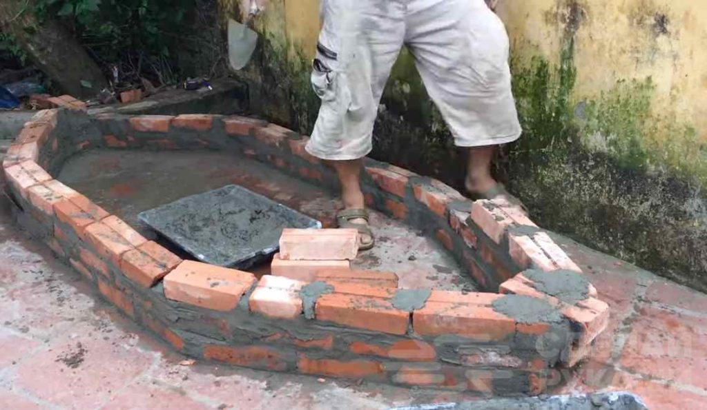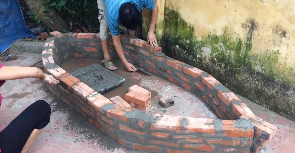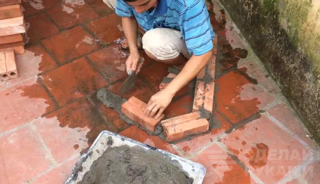После того как основание готово, автор укладывает на него первый ряд кирпичной стенки будущего декоративного пруда.