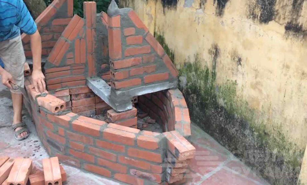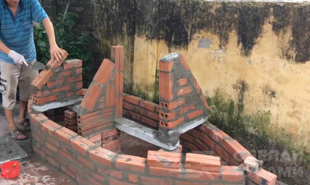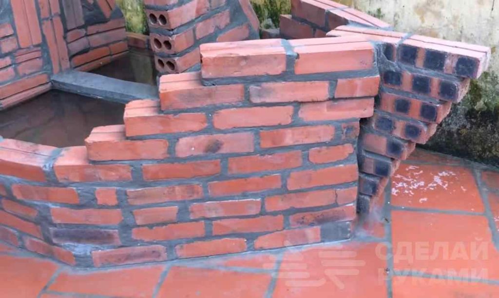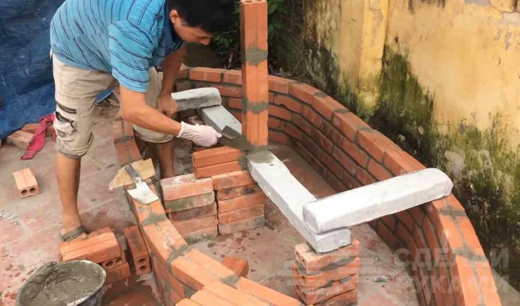 Сначала мастер возводит три кирпичных колонны. На них укладывается бетонный столбик. Затем еще два столбика укладываются перпендикулярно. Из кирпича автор делает «паруса».
